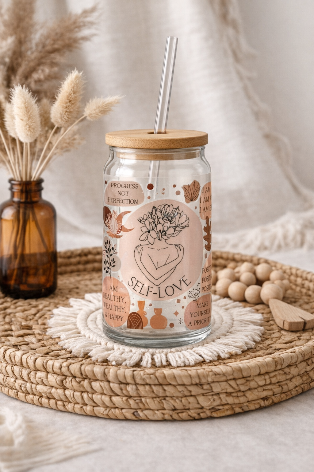 16oz glass can with bambo lid and straw. Made with UVDTF decal.